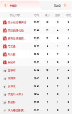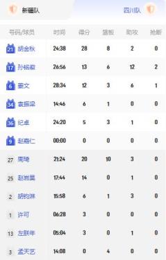 四川男籃:胡金秋28分8板2助,孫銘徽13分6板12助,姜文12分3板6助,周琦20分10板3助。