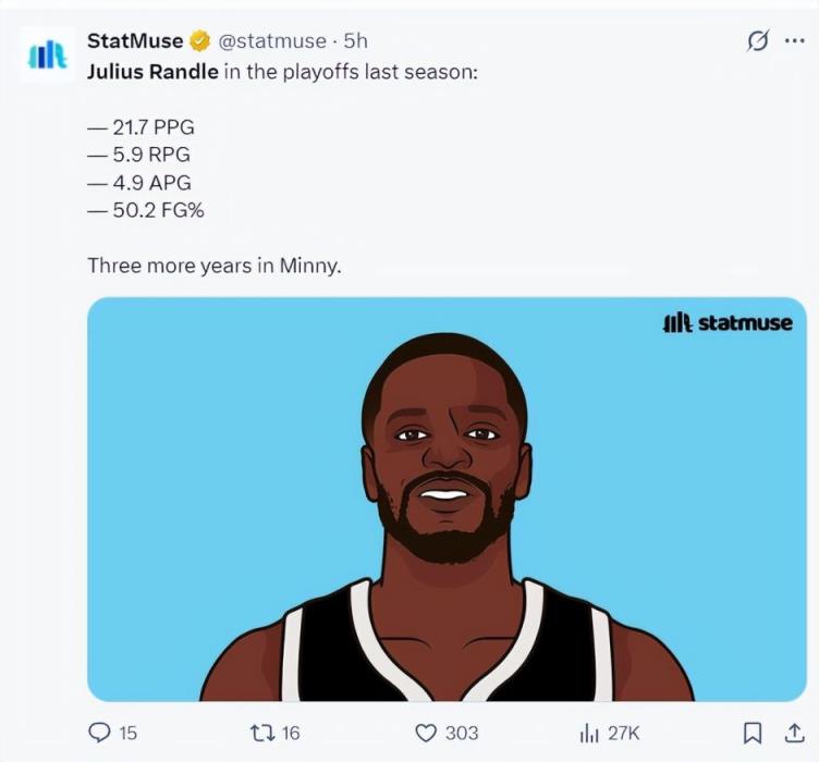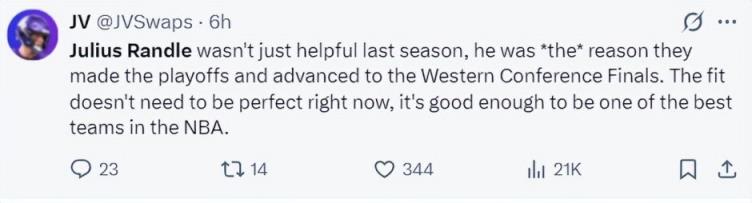 不過森林狼的球迷還是力挺他:蘭德爾不僅在上賽季表現(xiàn)出色,而且是他讓球隊得以進入季后賽,并成功晉級到西部決賽的關鍵因素。